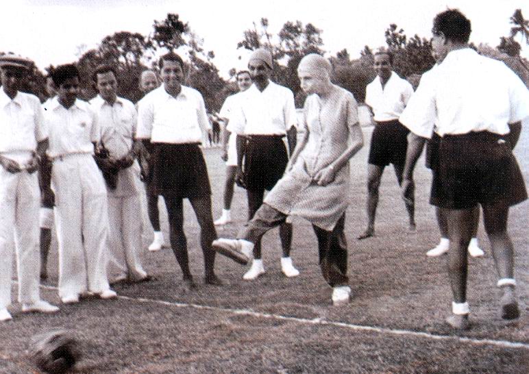• Nolini-Kanta-with-the-Mother-Tejendranath-Mukherjee-Pranab-Kumar-Bhattacharya-and-Udar-Pinto-in-the-Sports-Ground.-The-Mother-is-seen-here-starting-a-football-match-between-the-Adults-and-the-Youth.